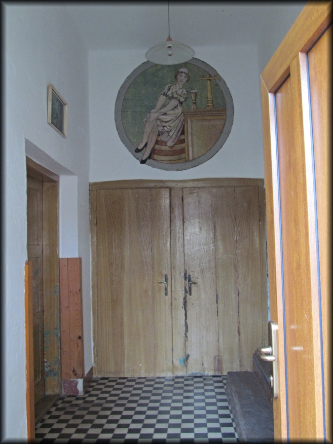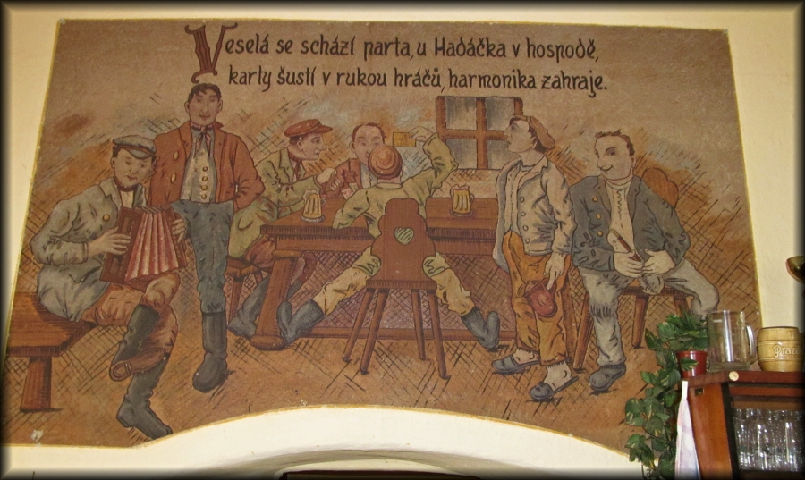 Výzdoba hostince je z roku 1948 a dominuje jí výjev nad dveřmi znázorňující tehdejší štamgasty.